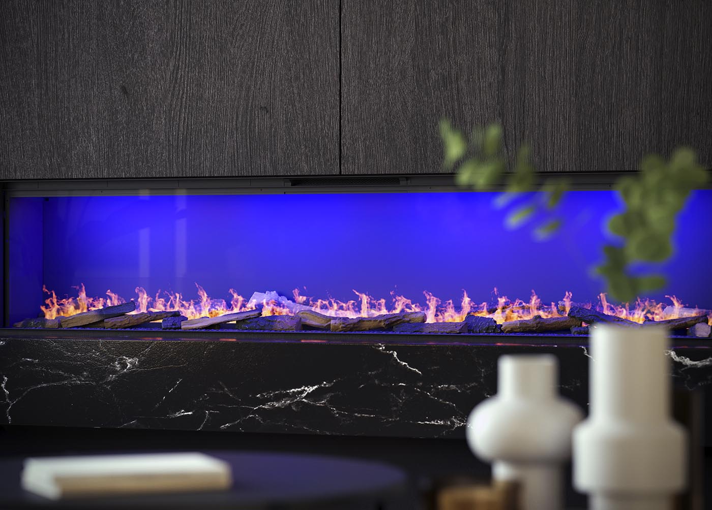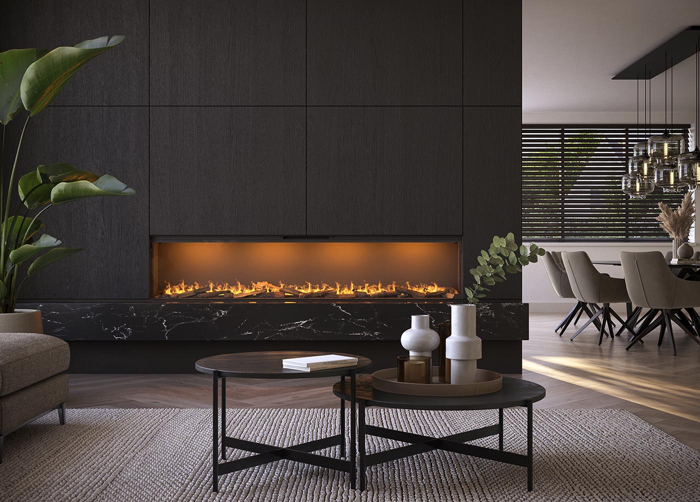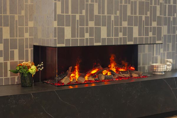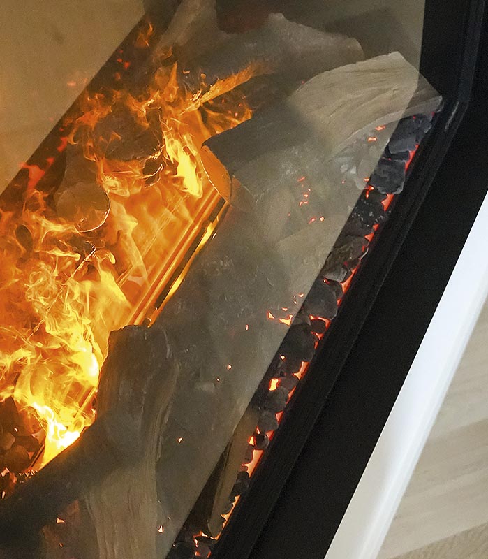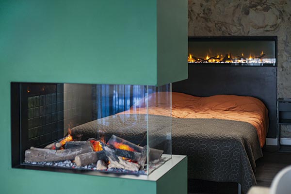 Deze haarden passen zich moeiteloos aan verschillende interieurs aan en vereisen zoals eerder gezegd enkel een stopcontact en, indien gewenst, een wateraansluiting voor een sfeervol vuurbeeld. “Zoals je hier ziet, kunnen de haarden eenvoudig worden geplaatst als stijlvol middelpunt in de woonkamer, als subtiele sfeermaker in de slaap- of badkamer, of zelfs als roomdivider tussen twee ruimtes”, vertelt Teun enthousiast terwijl we door de showroom wandelen. “Modellen zoals de e-MatriX Linear en e-MatriX Vertical bieden oplossingen voor uiteenlopende woonstijlen, van luxe penthouses tot nieuwgebouwde villa’s. En voor wie een extra slanke optie zoekt, is er de e-SliM Linear, ideaal voor een cinewall.”